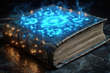 Ancient magical book with glowing blue glyphs and mystical smoke on stone surface