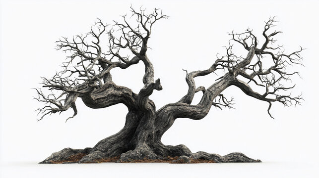 An old, gnarled tree with many branches, set against a white background, in the dark fantasy style, digital art