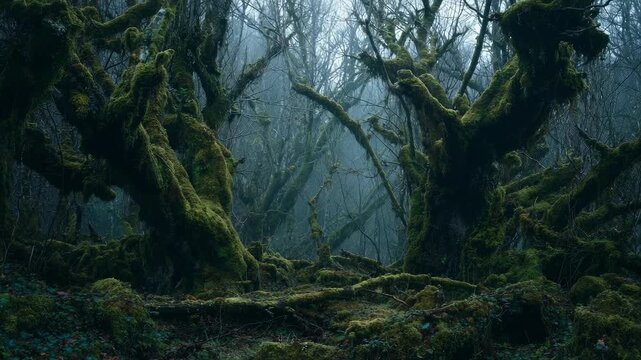 imaginative fantasy forest, foggy clouds, enchanted ancient oak trees, gnarled twisted branches and moss covered roots. lush green vegetation, bewitching woodland - high detail generative ai.
