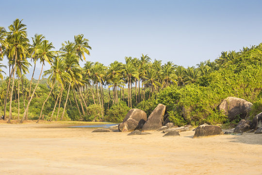 Canacona, Goa, India. Canoe Kayak For Rent Parked On Famous Palolem Beach On Background Tall Palm Tree In Summer Sunny Day