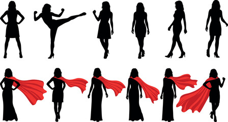 Powerful business woman superhero silhouette set with red flowing capes in various poses for leadership strength and female empowerment concepts