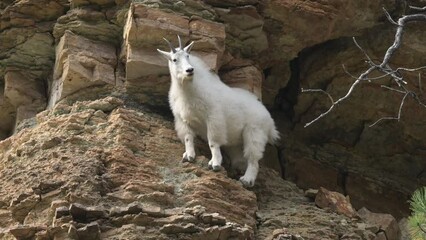 A mountain goat is standing on a cliff in the Spearfish Canyon area of South Dakota.
