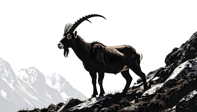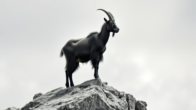 Majestic black goat perched on rocky summit against a cloudy sky in nature's wilderness