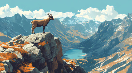 A goat standing on a rocky mountain ledge with a panoramic view of the valley below. Majestic Ridge. Illustration