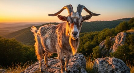 Majestic Goat Silhouetted Against a Scenic Sunset Landscape