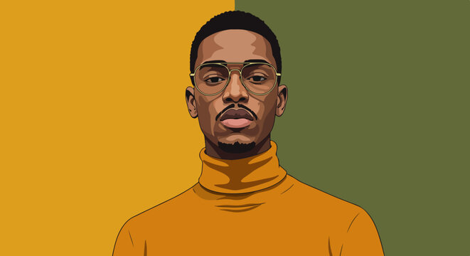 Young man with short dark hair, glasses, mustache, and goatee in orange turtleneck sweater on yellow and green diagonal background