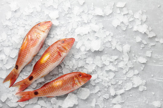 Fresh red mullet fish on icy stone background, top view