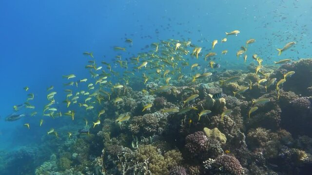 School of Yellowfin goatfish fish on a coral reef, slow motion