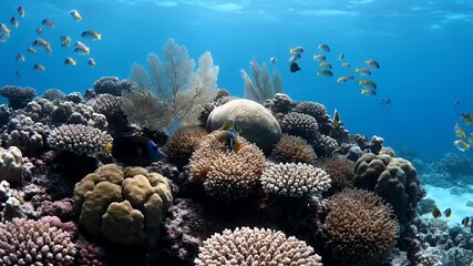 Coral reef and fish in ocean. Yellow goatfish and snappers .
