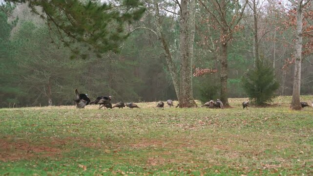 A flock of  wild turkeys with Beautiful, male wild turkeys displaying their feathers to hens in the hope of attracting a mate.