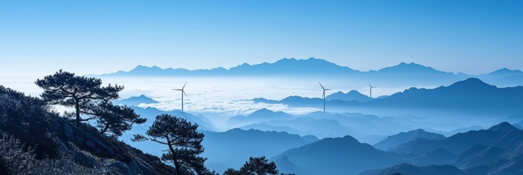 Expansive View of Wind Power Park on the Summit of Mount Goda Surrounded by Serene Misty Mountains and a Clear Blue Sky