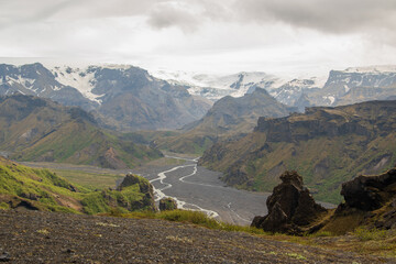 Wanderung durch Thorsmörk und Godaland im Süden von Island mit Blick auf die Schlucht mit dem Fluss Krossa. Im Hintergrund der Gletscher Myrdalsjökull auf der Caldera des Vulkans Katla.