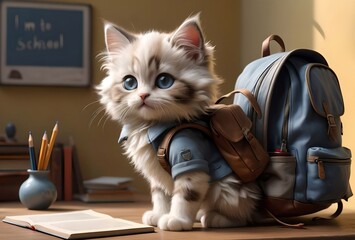 kitten schoolboy with a backpack and textbooks goes to school to study