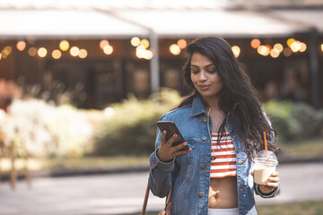 Beautiful happy girl goes shopping in the city.