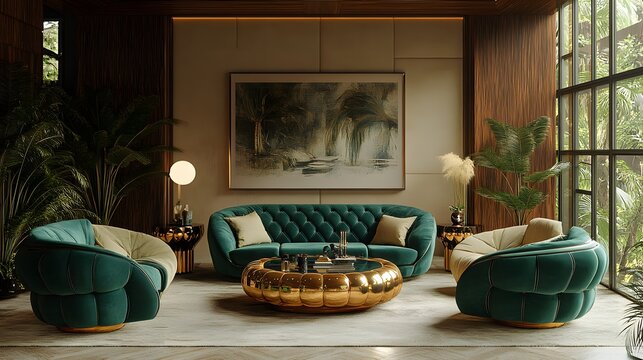 Art Deco room with forest green velvet decor, beige walls, and gold accents, glamorous and refined
