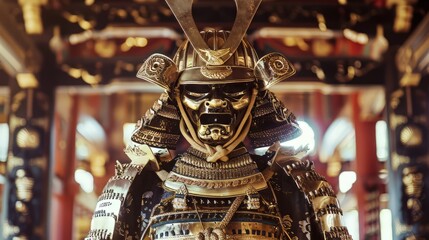 Full portrait of a samurai suit standing solemnly in a studio setting simple background enhancing the armors stoic elegance