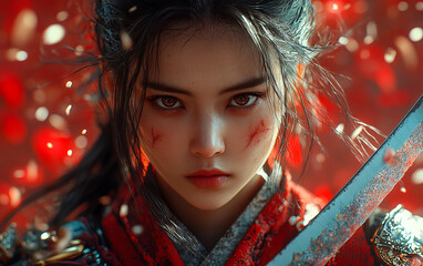 A close-up portrait of a samurai warrior with a menacing expression wearing traditional black armor and a gold helmet. The warrior's eyes glow red.