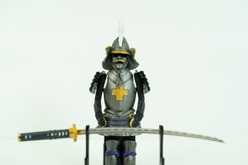 A young and handsome Japanese man in full Samurai armor with lacquer mask against a grey background