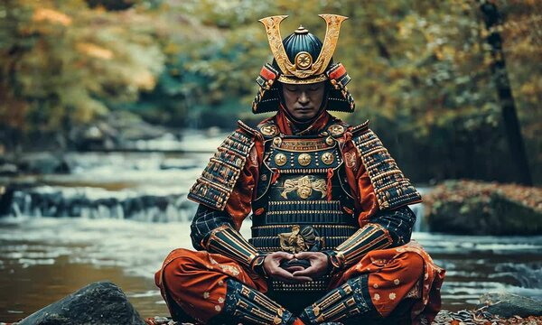 samurai in traditional armor, striking an action pose on a dramatic black backdrop -