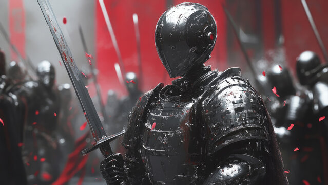 Samurai robot warriors in golden armor in a traditional Japanese setting