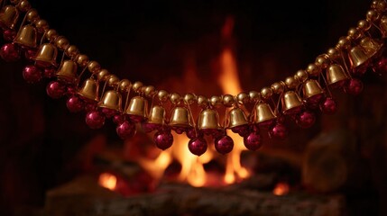 Close-up of a necklace made of gold bells and red beads. the necklace is draped over a fireplace, with the flames visible in the background.