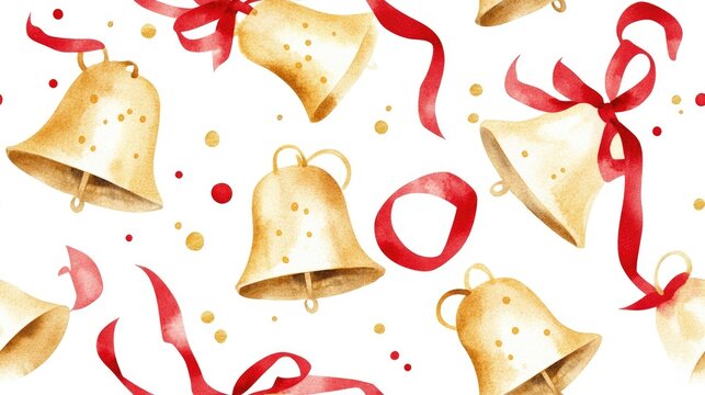 Shiny gold bells tied with a rich red ribbon. Festive holiday decor.