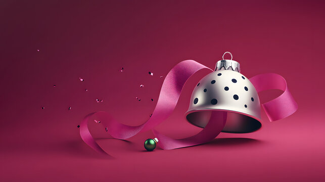Minimalist watercolor Christmas bells with delicate leaves and dots create festive pattern. design features pink, black, and gold bells, enhancing holiday spirit