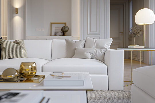 modern living room, Modern living room interior design featuring a pristine white sofa, a chic coffee table, and opulent gold decor elements