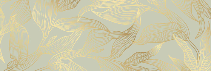Vector abstract luxury background, gold line floral wallpaper, leaves texture. Golden botanical modern, art deco pattern, elegant foliage wavy ornament