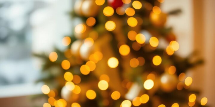 Soft focus Christmas decorations with copy space. Seasonal winter holiday concept. Traditional artificial Christmas tree with garland lights and glowing gold lights in background.