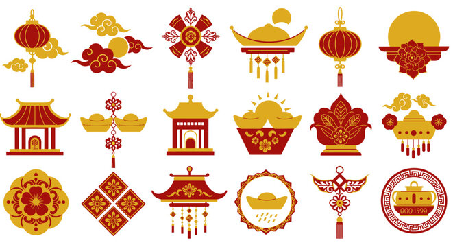 Vibrant abstract design featuring red and gold motifs with clouds and geometric patterns, creating a striking visual effect.