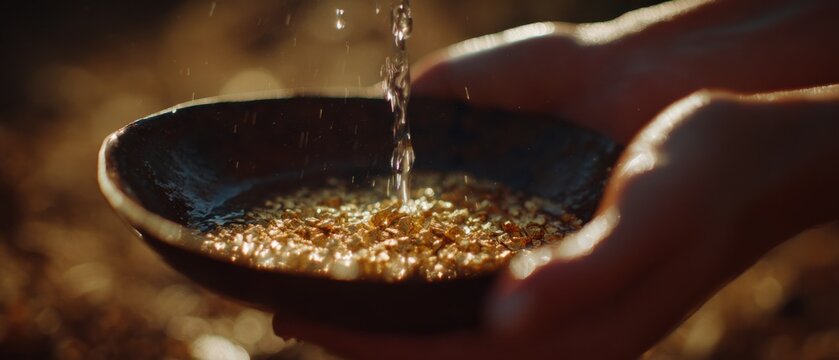 Hands holding gold pan with shimmering water and gold flakes