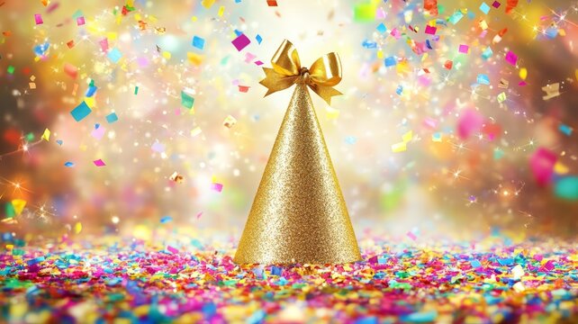 Shiny Gold Party Hat Surrounded by Colorful Confetti