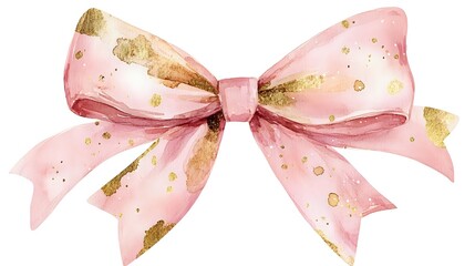 Pink watercolor bow with gold glitter accents and polka dot pattern on transparent background, elegant decorative element for festive designs and celebrations.