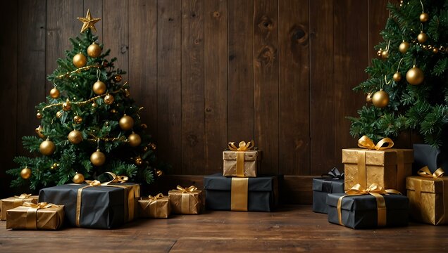 Christmas tree with black and gold presents against a wooden wall.