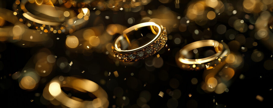 Two gold rings are placed on a black background. The rings are shiny and sparkly, giving off a luxurious and elegant vibe
