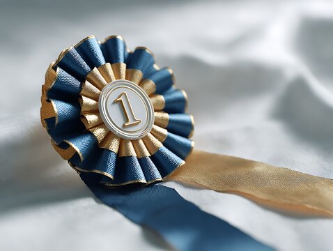 Blue and gold rosette with number one, symbol of first place, championship, success, recognition, victory and sporting award with elegant decorative ribbon prize