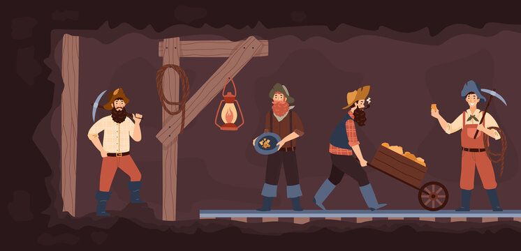 Group of Prospectors Male Characters Wearing Vintage Costumes and Hats Panning Golden Sand and Prills Sitting on River Side with Pickaxe and Spade. Gold Rush Concept. Linear People Vector Illustration