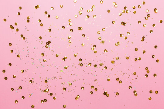 Pink background with gold sequins and shining paillettes. Suitable for backdrop for your design. Top view, copy space.