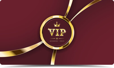 For premium persons, a VIP card invitation, rectangular, on a dark burgundy background with gold stripes and a gold round logo inside with text in a frame with glitter. Vector illustration.