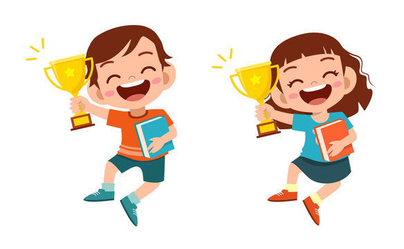 happy cute kids win game gold trophy