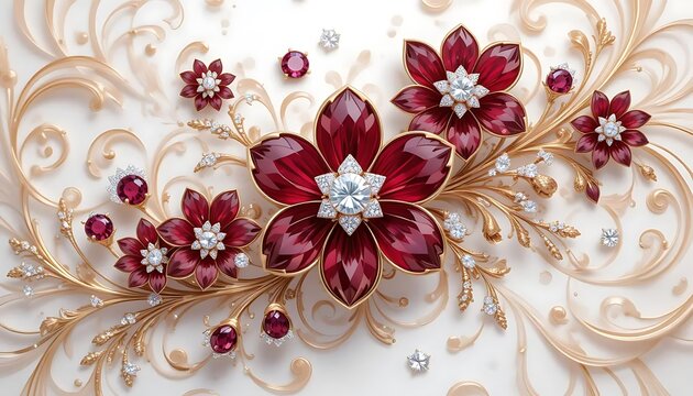 Elegant Floral Arrangement with Ruby and Diamond Accents on Ornate Gold Vines.