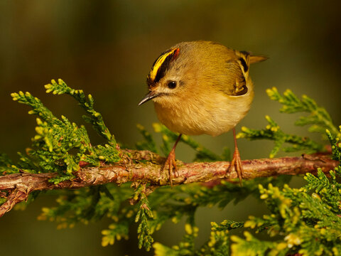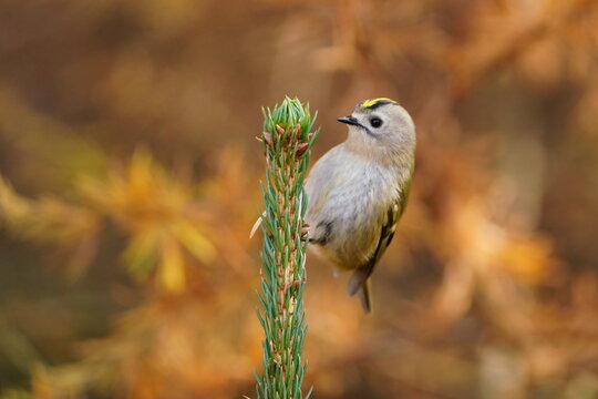 Goldcrest, regulus regulus, golden-crested kinglet. The smallest bird in Eurasia