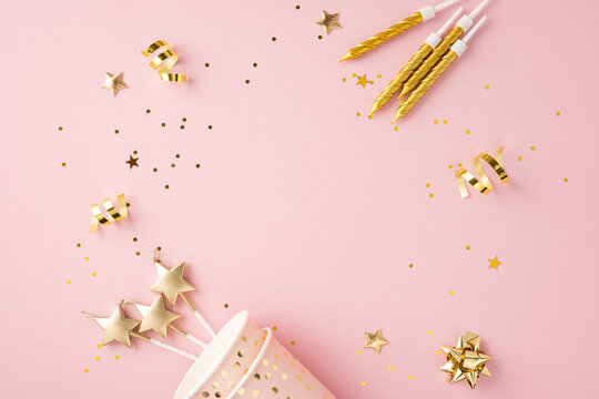Elegant birthday celebration scene with golden decorations like stars, ribbons, and candles on a pink backdrop creating a festive atmosphere