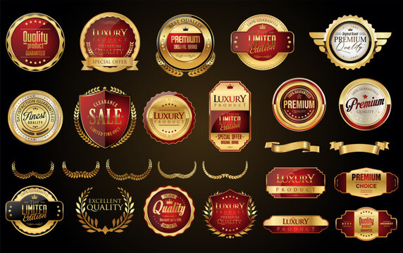 set of Gold badge set. For guaranteed, black ribbon, high quality, tag and banner. Can use for romote product or service. Luxury premium golden badges and labels, Four gold badges on white background
