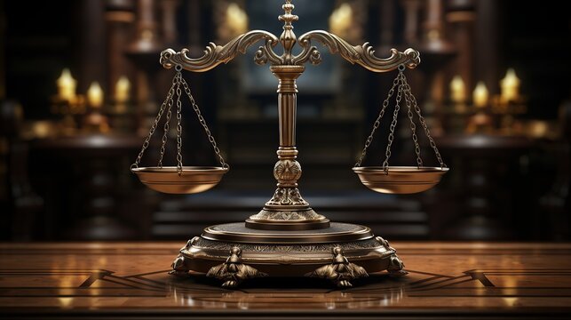 Golden scale of justice placed on a polished wooden desk inside a law office