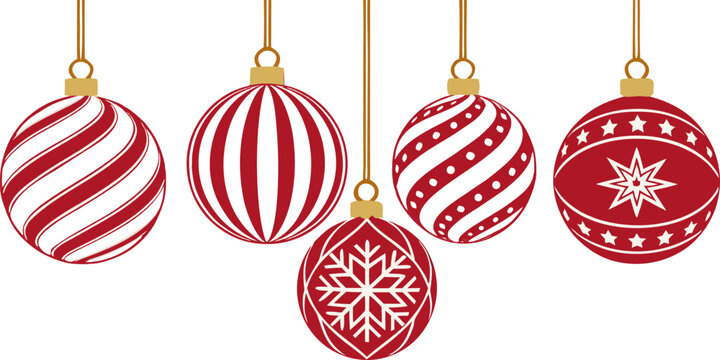 Christmas bauble set with red glossy ornaments, realistic lighting and shadows, hanging from golden strings, ideal for winter holiday illustrations.