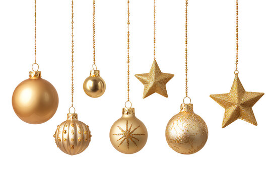 Golden Christmas baubles, stars, and balls hanging on strings, isolated on transparent background.