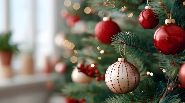 Detailed view of a traditional Christmas tree adorned with shiny red and patterned white baubles and warm blurred golden lights evoking a cozy winter holiday celeb n