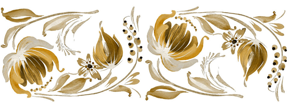 Floral seamless border pattern from gold colored peony flowers, berry bunches and golden leaves on a white background